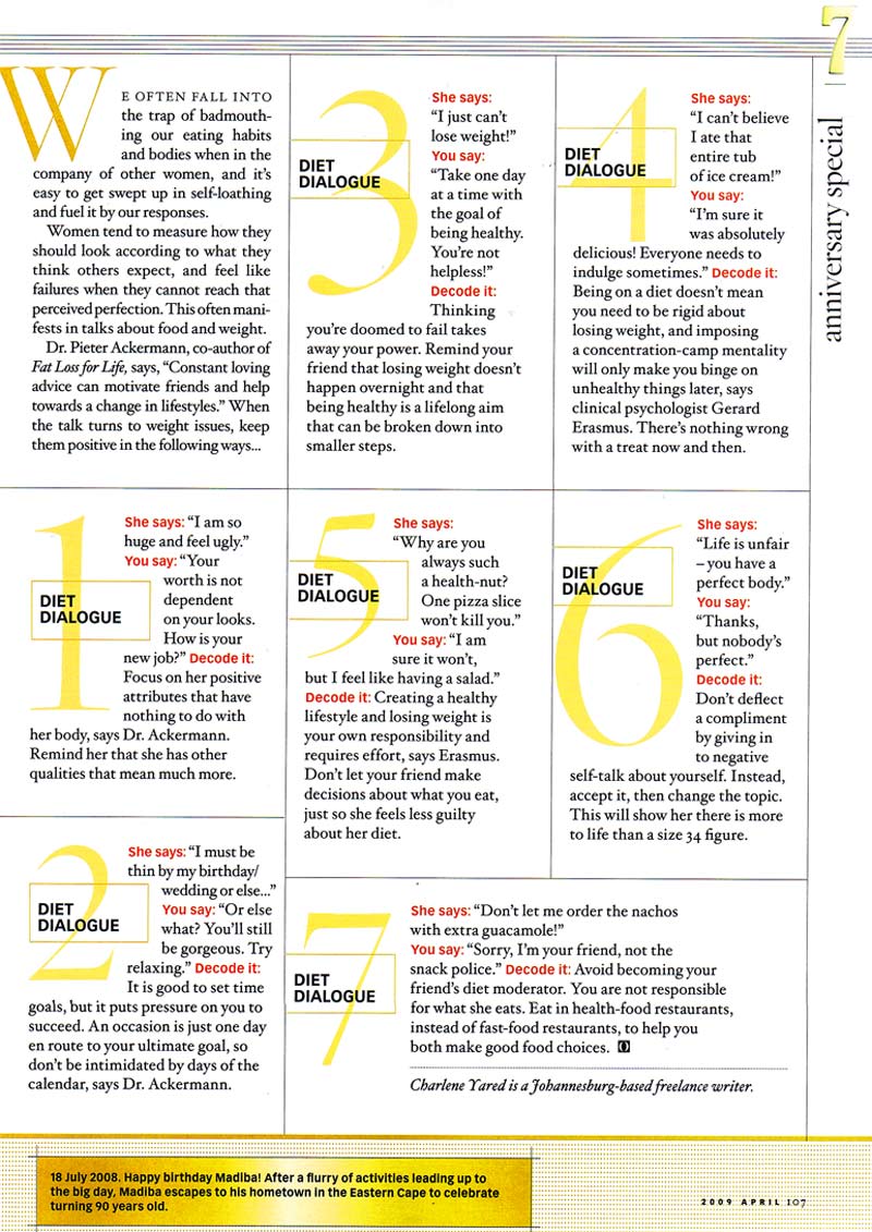 “Negative self-talk may be a ploy to elicit encouragement from others, while it could also be a sign of low self-esteem, which may be related to weight and size issues,” says clinical psychologist, Gerard Erasmus. Women measure how they should look according to what they think others expect, and so feel like a failure when they cannot reach that level of perceived perfection. These feelings are often manifested in conversations about food and weight issues.