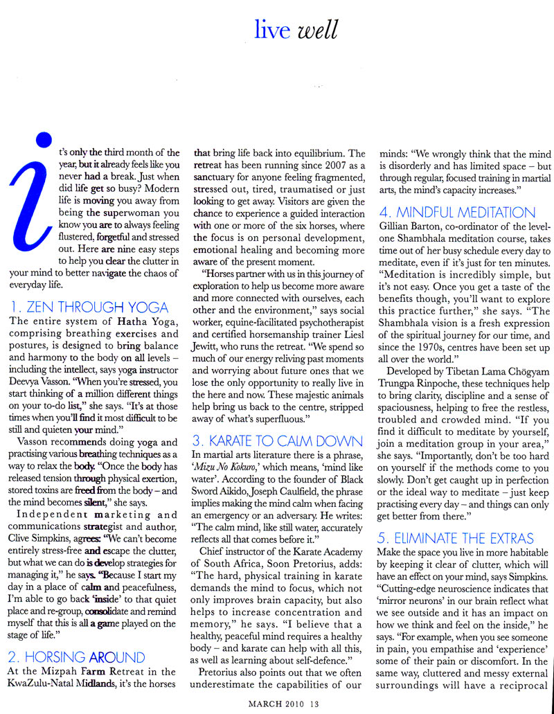 The entire system of Hatha Yoga, comprising breath-work and postures, is designed to bring balance and harmony to the body on all levels – including the intellect, says qualified yoga instructor, Deevya Vasson. “When you’re stressed, you start thinking of a million different things on your to-do list,” she says. “It’s at those times when you’ll find it most difficult to be still and quieten your mind.” Vasson recommends doing yoga and practising various breathing techniques as a way to relax the body. “Once the body has released tension through physical exertion, stored toxins are freed from the body – and the mind becomes silent,” she says. Independent Marketing and Communications strategist and author, Clive Simpkins, agrees. “We can’t become entirely stress-free and escape the clutter, but what we can do is develop strategies for managing it,” he says. “Because I start my day in a place of calm and peacefulness, I’m able to go back ‘inside’ to that quiet place and re-group, consolidate and remind myself that this is all a game played on the stage of life.”