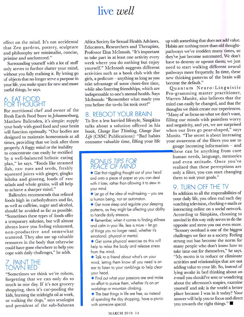 To live a less harried lifestyle, uncluttered by the unnecessary, Simpkins talks about a solution offered in his book, Change Your Thinking, Change Your Life; “Bad habits consume valuable time, filling your life up with something that does not add value – but instead only adds to the clutter. Habits are nothing more than old thought-pathways we’ve trodden many times, so they’ve just become automated,” he says. “We don’t have to destroy or uproot them. We just need to start walking different neural pathways more frequently. In time, these new thinking patterns of the brain will become the default.” Quantum Neuro-Linguistic Programming Master Practitioner, Warren Munitz, also believes that the mind can easily be changed and that the thoughts we think create our experiences. “Many of us focus on what we don’t want, filling our minds with pointless worry and negativity, and yet, we are surprised when our lives go pear-shaped,” says Munitz. “The secret is about increasing your awareness of the filters you use to gauge incoming information – and these can be anything from core human needs, language, memories and even attitude. Once you’ve realised that these perceptions are only a filter, you can start by changing them to suit your goals.”