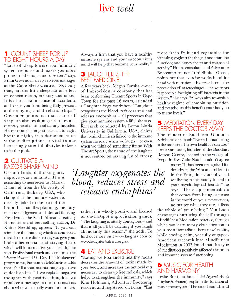 A few years back, Megan Furniss, owner of Improvision, a company performing the show TheatreSports in Cape Town for the past 16 years, attended a Laughter Yoga workshop. “Laughter oxygenates the blood, reduces stress and releases endorphins – all processes which give your immune system a lift,” she says. Research conducted by Loma Linda University in California claims that brain chemicals linked to the immune system increase when we laugh – or even think of something funny. With TheatreSports, the nature of the laughter is not centred on making fun of others – rather it is wholly positive – and focused on on-the-spot improvisation games. “The laughing is utterly contagious – and that is all you’ll be catching if you laugh abundantly this season,” she adds.
