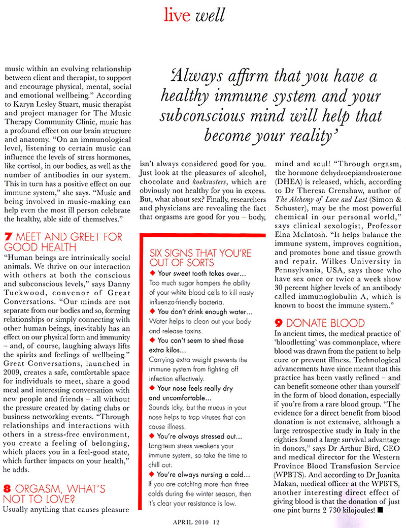 Certain kinds of thinking may improve your immunity. This is according to the neuroscientist, Marian Diamond of the University of California, Berkeley, who claims that the immune system is directly linked to the part of the brain that handles planning, memory, initiative, judgement and abstract thinking. President of the South African Creativity Foundation and best-selling author, Dr Kobus Neethling, agrees. “If you can stimulate the thinking which is connected to each of these dimensions, you give your brain a better chance of staying sharp, which will in turn affect your health,” he says. Professional coach and Author of the Pretty Powerful 90-Day Life Makeover program, Samantha McMurtrie, adds that it’s all about maintaining a positive outlook on life. “It we replace negative thoughts with positive thoughts – we reinforce a message in our subconscious that we actually want for our lives, – so, always affirm that you have a healthy immune system and your subconscious mind will help that become your reality!”