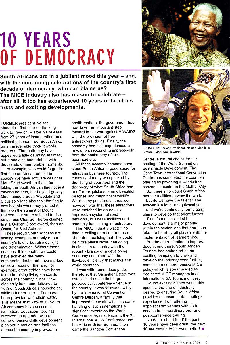 10 Years of Democracy June 14, 2010March 16, 2023 Author: Charlene Yared-West, Published in Meetings SA, Issue 4, 2004, p 9. Share this:TweetLike Loading... Related