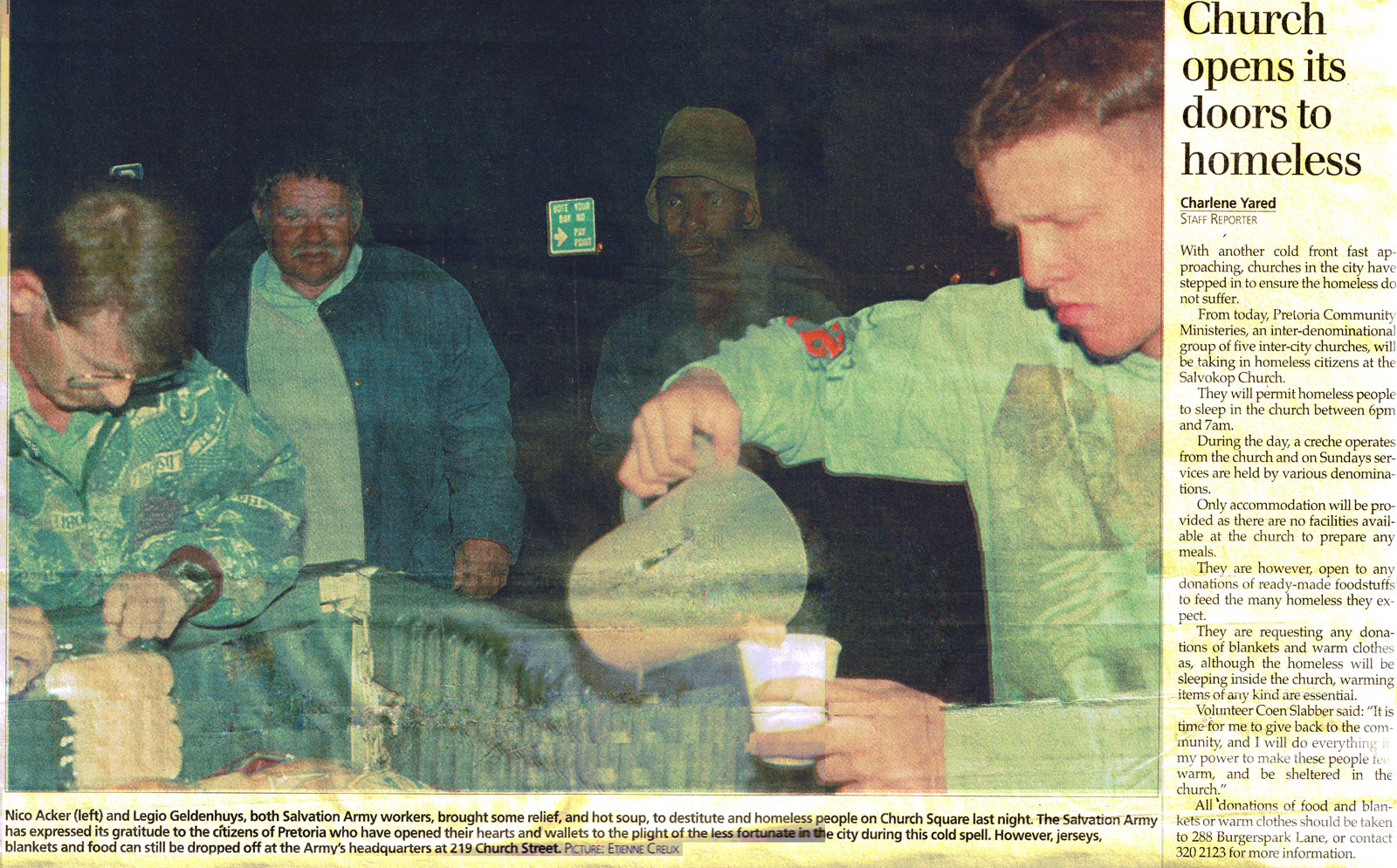 Church opens its doors to the homeless June 14, 2010March 16, 2023 Author: Charlene Yared-West, Published in Pretoria News, 19 July, 2000. Share this:TweetLike Loading... Related