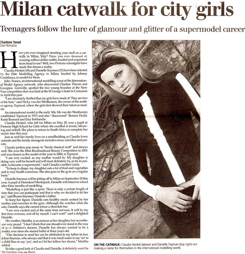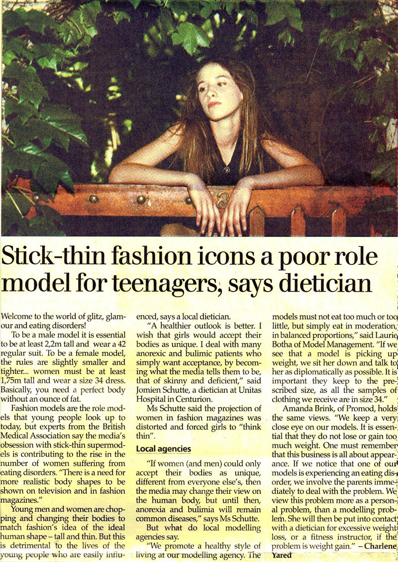 Milan catwalk for city girls / Stick-thin fashion icons a poor role model for teenagers, says dietician June 14, 2010March 16, 2023 Author: Charlene Yared-West, Published in Pretoria News, 14 July, 2001. Share this:TweetLike Loading... Related