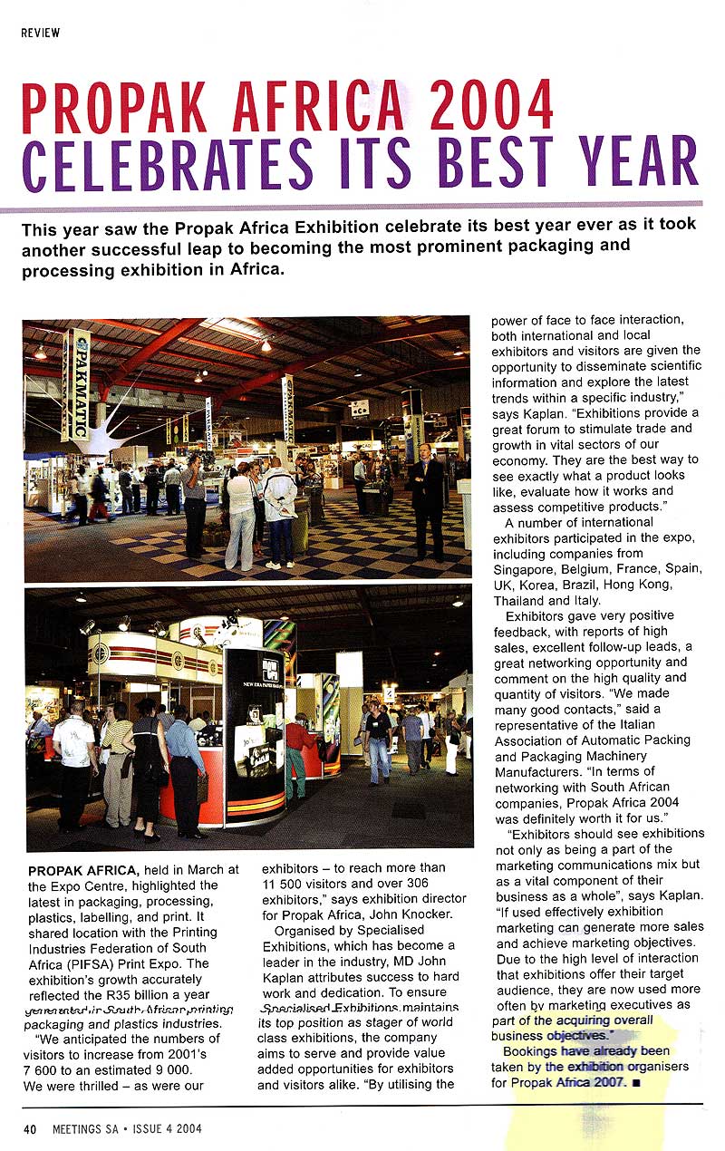 Propak Africa 2004 Celebrates Its Best Year June 14, 2010March 16, 2023 Author: Charlene Yared-West, Published in Meetings SA, Issue 4, 2004, p 40. Share this:TweetLike Loading... Related