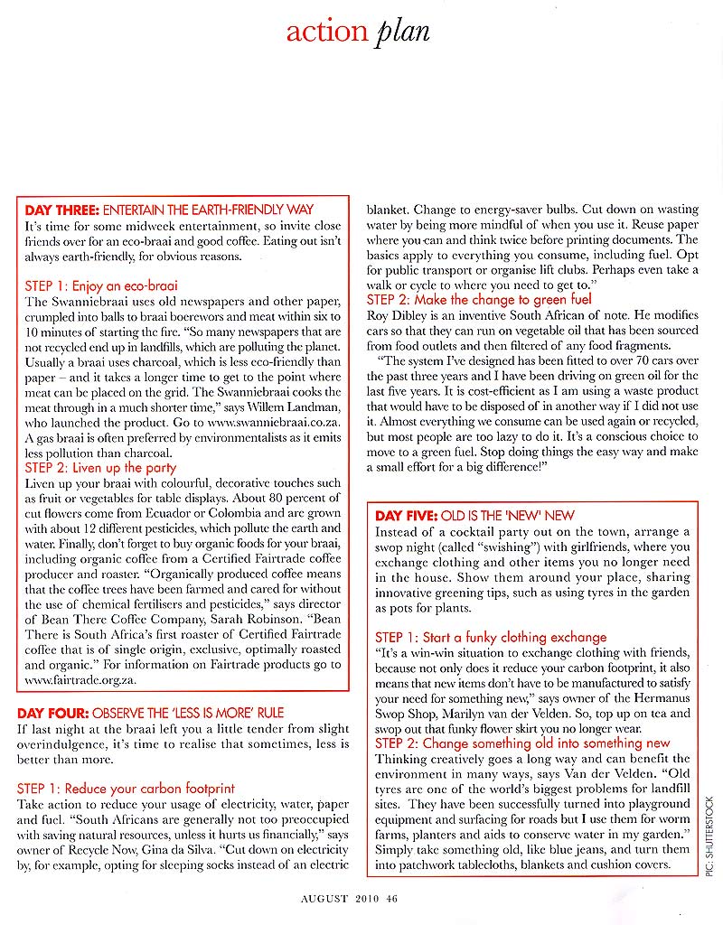Roy Dibley is an inventive South African of note. He modifies cars so that they can run on vegetable oil, sourced from food outlets that have been filtered of any food fragments. “The system I’ve designed has been fitted to over 70 cars over the past three years and I have been driving on green oil for the last five years. It is very cost efficient as I am using a waste product that would have to be disposed of in another way if I did not use it. Almost everything we consume can be used again or recycled, but most people are too lazy to do this. It’s a conscious choice to move to a green fuel. Stop doing things the easy way and make a small effort for a big difference!”