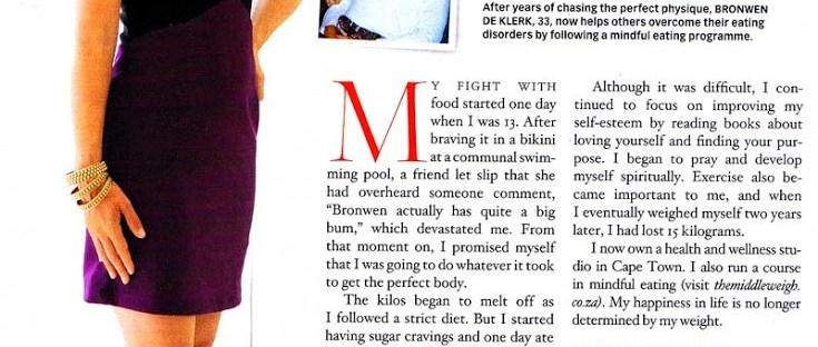 As I started getting in touch with my inner self, I changed careers, from being a computer programmer to working as a personal trainer, which lead to the discovery of yoga, shiatsu and pilates. I now run my own health and wellness studio in Tamboerskloof, Cape Town and run a course in mindful eating (www.themiddleweigh.co.za). My happiness in life is no longer determined by my weight.