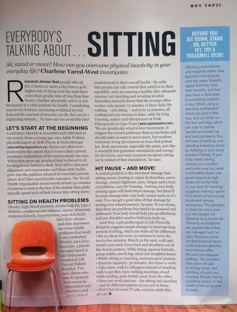 Obesity, high blood pressure, excess body fat, abnormal cholesterol levels, cardiovascular disease, type 2 diabetes, hypertension, cancer, non-alchoholic fatty-liver disease and even depression are some of the health problems which result from a sedentary lifestyle, says Mr Zeno Rossouw, physiotherapist based at Life Orthopaedic Hospital at Vincent Pallotti. “In my scope of practice I have seen clients who take for granted their access to information and education and have a lack of commitment to their overall health,” he says. He adds that people can only control that which is in their capability, such as ensuring a healthy diet, adequate exercise, not smoking and avoiding alcohol. Australian research shows that the average office worker only spends 73 minutes of their daily life walking – not sitting – and so in 73 minutes all their cooking, walking and any exercise they may get is done, adds Dr Greg Venning, author and chiropractor at Peak Chiropractic in Cape Town (capetownchiro.com). “We are genetically wired to love movement. It triggers the reward pathways deep in our brain and should make us want to move more, but modern sedentary living disconnects us from that primal joy. Movement of the body, especially the spine, acts like a windmill that generates stimulation and energy for the brain and every moment we spend sitting we’re robbed of that stimulation,” he says.
