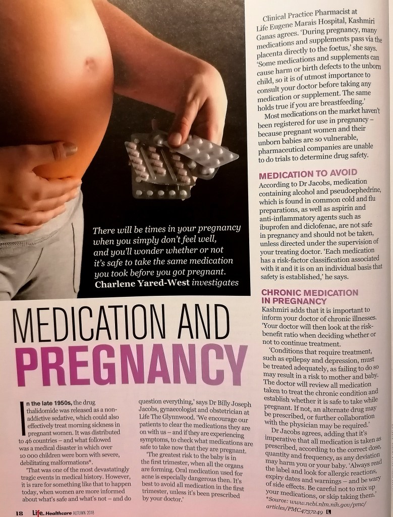 In the late 1950s the drug ‘Thalidomide’ was released as a non-addictive sedative, which could also effectively treat morning sickness in pregnant women. It was distributed to 46 countries and what followed was a medical disaster where over 10,000 children were born with a range of severe debilitating malformations. “That was one of the most devastatingly tragic events in medical history – one that should never be repeated. However, it is rare for something like that to happen again in our day and age, where women are more informed about what’s safe and what’s not – and do question everything,” says Dr Billy Joseph Jacobs, gynaecologist and obstetrician at Life Glynnwood. “We encourage all our patients to clear the medications they were on with us – and if they are experiencing symptoms, to check with us what medications are safe to take now that they are pregnant,” he says. “The greatest risk to the baby is in the first trimester of pregnancy when all the organs are forming. Oral medication used for acne is especially dangerous then. It is best to avoid all medication in the first trimester, unless prescribed by your doctor.”