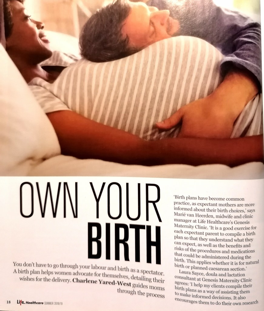 “Birth plans have become common practice now, as expectant mothers are more informed about their birth choices,” says Marié van Heerden, midwife and hospital manager at Genesis Maternity Clinic. “It is a good exercise for each expectant parent to inform themselves of their options through compiling a birth plan, so that they understand what they can expect, as well as benefit and risk of procedures and medication – and know where they can make certain choices. This applies to any type of birth, whether it is for a natural or planned caesarean section.” Laura Sayce, doula and lactation consultant at Genesis agrees; “I help my clients to compile their birth plans as a way of helping them make informed decisions. It also encourages them to do their own research into each element of the birth and then to make choices based on this information.”