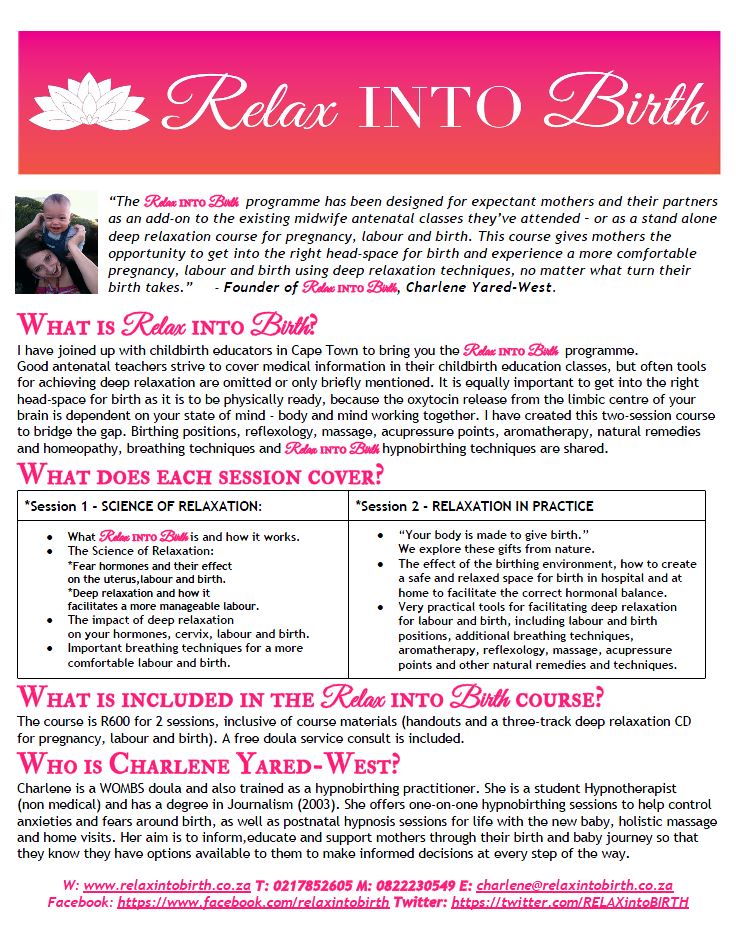 RelaxIntoBirthFlyer Previous Next Published June 6, 2015 at 736 × 948 in Cape Town Relax Into Birth Antenatal Course Share this:Tweet