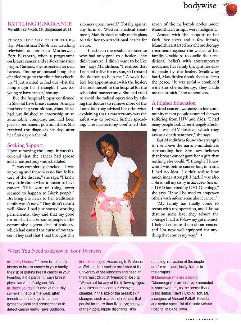 It was like any other Thursday. Mandithiza Pikoli was watching television at home in Motherwell, Port Elizabeth when a programme about breast cancer and self-examination began. Curious, she went to her room and immediately started inspecting her own breasts. Finding an unusual lump in her left breast, she decided to go to the clinic on the following Monday for a check-up. “I was simply curious, not frightened, to find out what the lump might be, because I thought I was too young to have anything as serious as cancer,” she says.