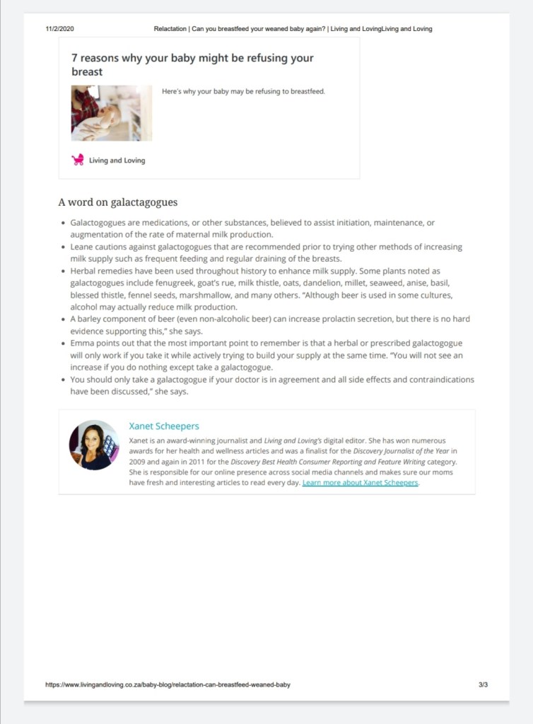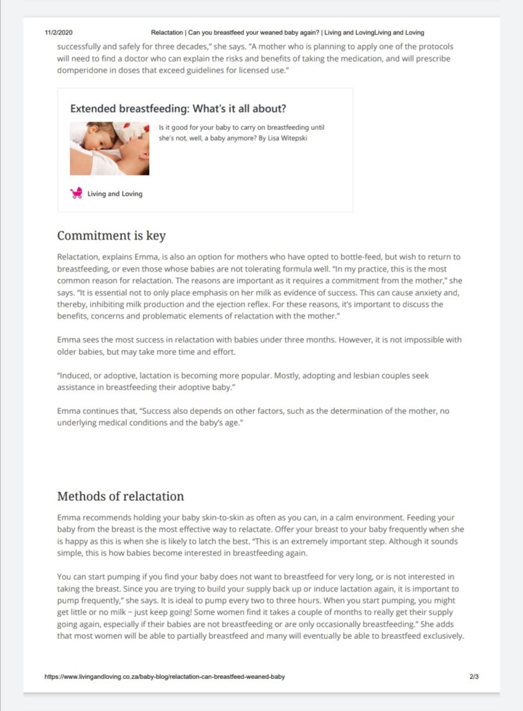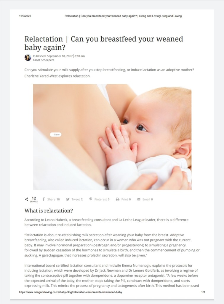 According to Leana Habeck, La Leche League Leader (llli.org/southafrica), there is a difference between relactation and induced lactation. “Relactation is about re-establishing of milk secretion after weaning baby from the breast,” says Leana. “Adoptive breastfeeding, also called induced lactation in a woman who was not pregnant with the current baby, may involve hormonal preparation (oestrogen and/or progesterone – simulating a pregnancy) followed by sudden cessation of the hormones (simulating a birth) and then the commencement of pumping or suckling and a galactagogue that increases prolactin secretion.” Internationally Board Certified Lactation Consultant, childbirth educator and midwife Emma Numanoglu explains the protocols for inducing lactation, developed by Dr. Jack Newman and Lenore Goldbarb, as involving a regime of taking the contraceptive pill together with domperidone. “A few weeks before the expected arrival of the baby the mother stops taking the pill, continues with domperidone and starts expressing milk (this mimics the process of pregnancy and lactogenesis after birth). This method has been used successfully and safely for three decades by many women who induced lactation,” she says. “A mother who is planning to apply one of the protocols will need to find a doctor who is supportive of breastfeeding, can explain risks and benefits of taking the medication, and is willing to take responsibility for prescribing domperidone in doses that exceed guidelines for licensed use.”