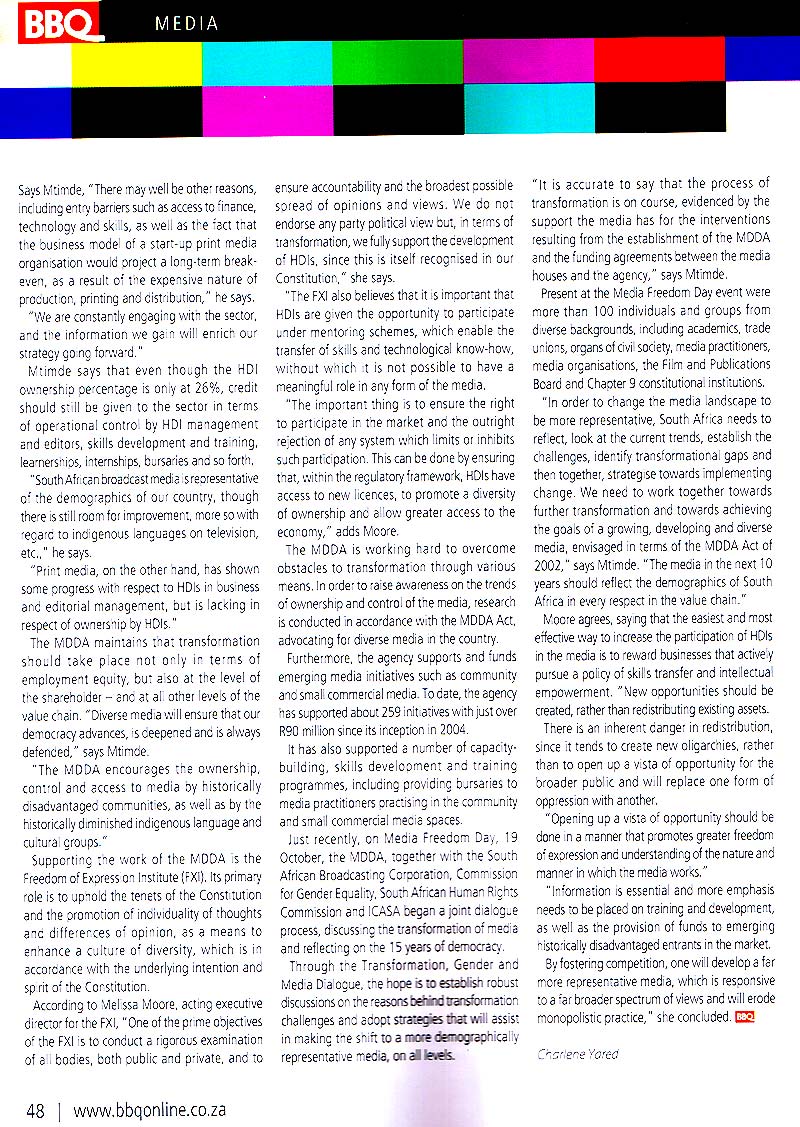 According to Melissa Moore, acting executive director for the FXI, “One of the prime objectives of the FXI is to conduct a rigorous examination of all bodies, both public and private, and to ensure accountability and the broadest possible spread of opinions and views. We do not endorse any party political view but, in terms of transformation, we fully support the development of HDIs, since this is itself recognised in our Constitution,” she says. “The FXI also believes that it is important that HDIs are given the opportunity to participate under mentoring schemes, which enable the transfer of skills and technological know-how, without which it is not possible to have a meaningful role in any form of the media. The important thing is to ensure the right to participate in the market and the outright rejection of any system which limits or inhibits such participation. This can be done by ensuring that, within the regulatory framework, HDIs have access to new licenses, to promote a diversity of ownership and allow greater access to the economy.”