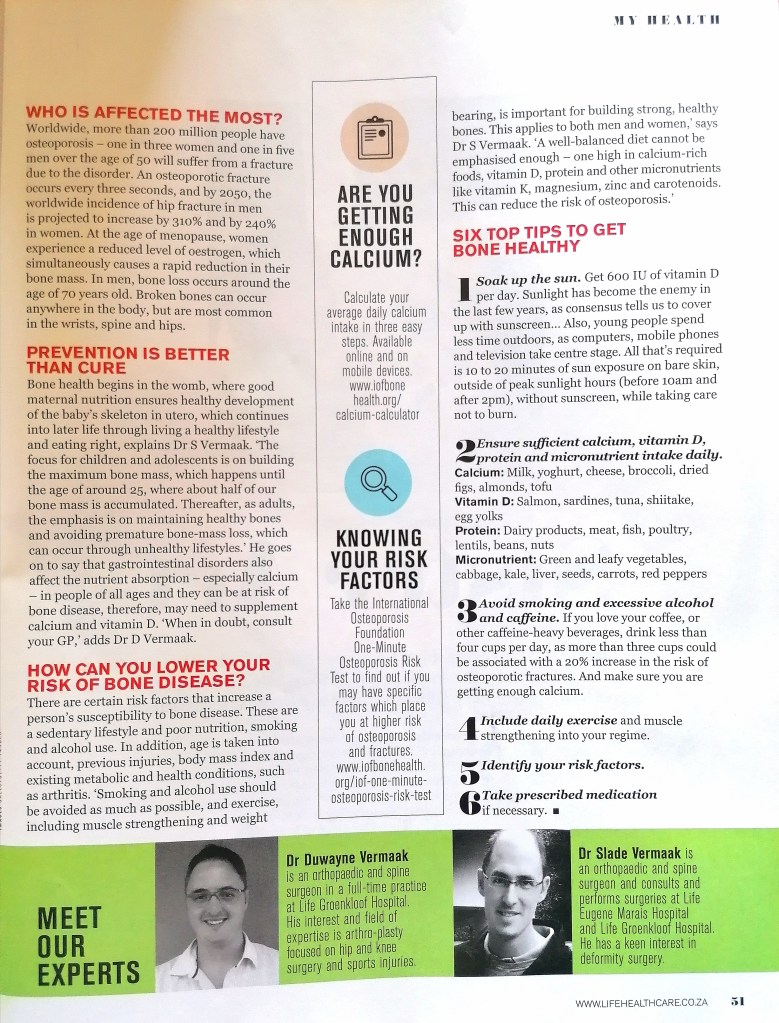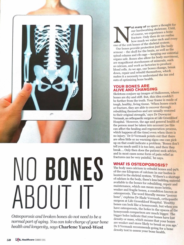 Not many of us spare a thought for our hardworking skeletons, until of course, we experience a bone fracture. Only then do we realise how much we appreciate each and every one of the 206 bones of the skeletal system. Our bones provide protection just like body armour, keeping our essential organs safe, such as the skull for the brain and the spinal column and the rib cage. Our bones also allow the body movement, through the leverage of the muscles and are also magnificent storehouses of minerals, such as calcium and also work as factories to produce blood cells. As we age, our bones change, break down, repair and rebuild themselves throughout our lives, which makes it a necessity to understand the ins and outs of optimising our bone health. Charlene Yared-West speaks to Life Healthcare Orthopaedic Surgeons and brothers, Dr Duwayne Vermaak and Dr Slade Vermaak on the topic and finds out how to achieve this lifelong goal.